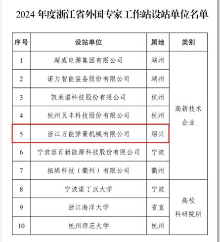 19th 12.2024 在全球化與科技創(chuàng)新的驅(qū)動(dòng)下,浙江省外國專家工作站成為吸引國際高端人才、推動(dòng)企業(yè)創(chuàng)新發(fā)展的重要平臺(tái)。自2020年《浙江省外國專家工作站管理辦法》實(shí)施以來,紹興市在吸引外籍專家方面取得了顯著成績。截至目前,紹興市已有6家單位獲批為省級(jí)外國專家工作站,位居全省前列。 2024年,浙江萬能彈簧機(jī)械有限公司榮...